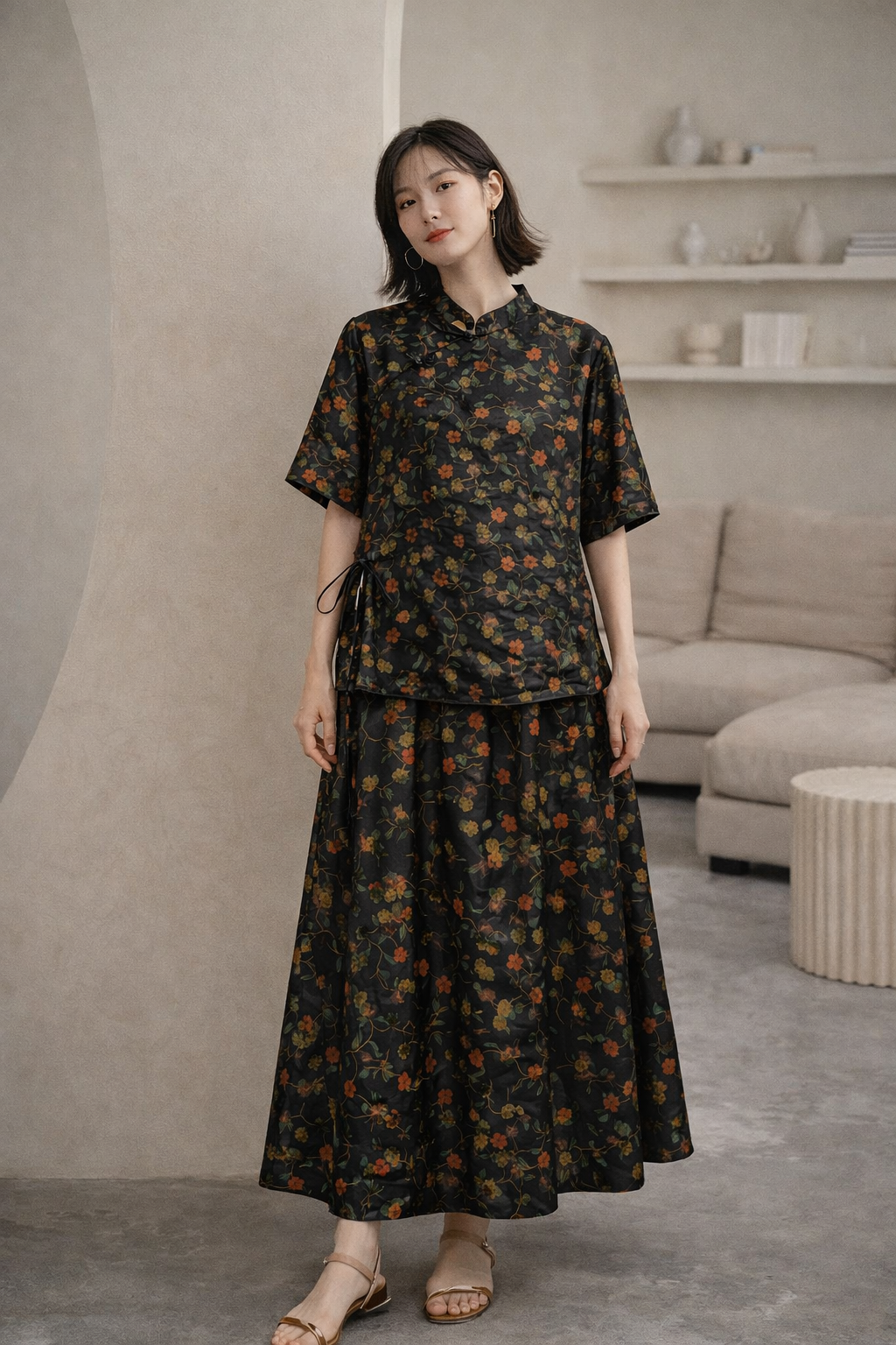 The Midnight Vine Silk Set is crafted from smooth silk-blend fabric featuring delicate amber and muted green vine florals against a deep black base.