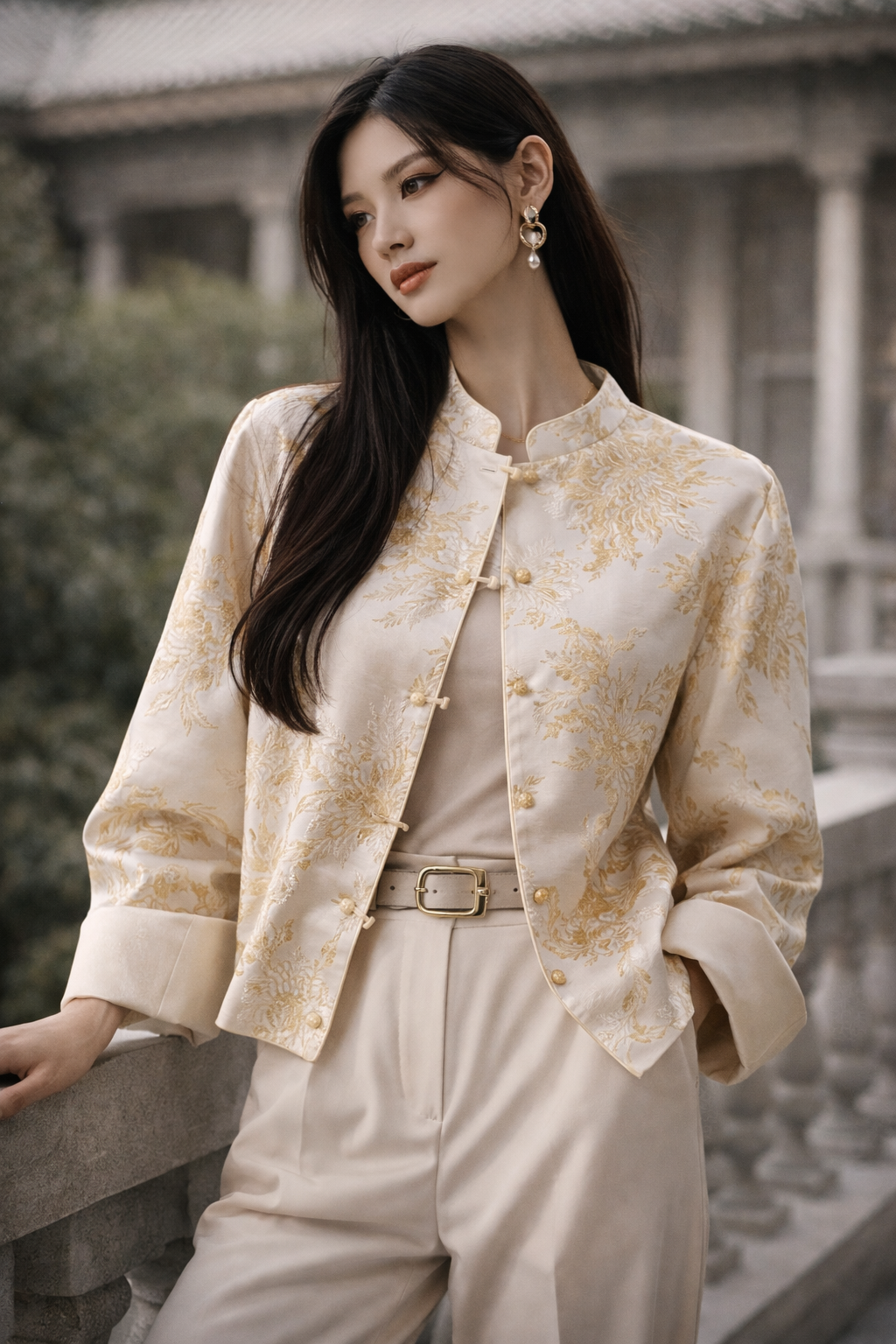 Crafted in a luminous champagne base with intricate gold jacquard weaving, this Mandarin jacket blends heritage craftsmanship with contemporary structure.