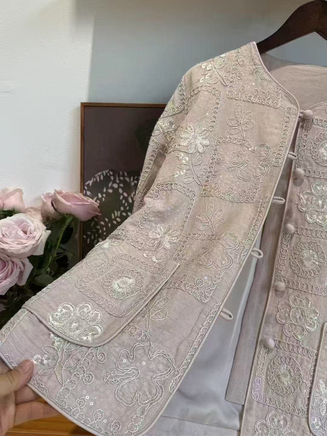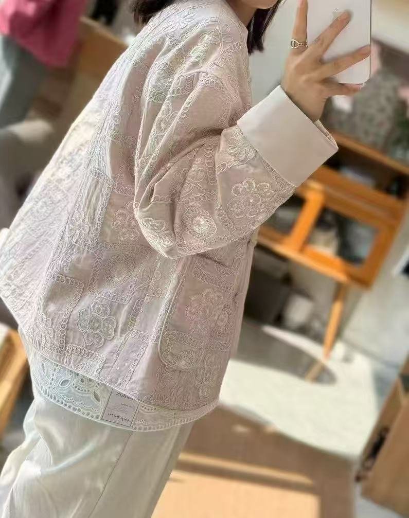Inspired by modern Chinese aesthetics and timeless craftsmanship, this Deerhui Secret embroidered jacket blends tradition with effortless elegance. Crafted from a lightweight linen-blend fabric, it features delicate floral embroidery arranged in soft geometric panels, symbolizing harmony, nature, and quiet strength.
