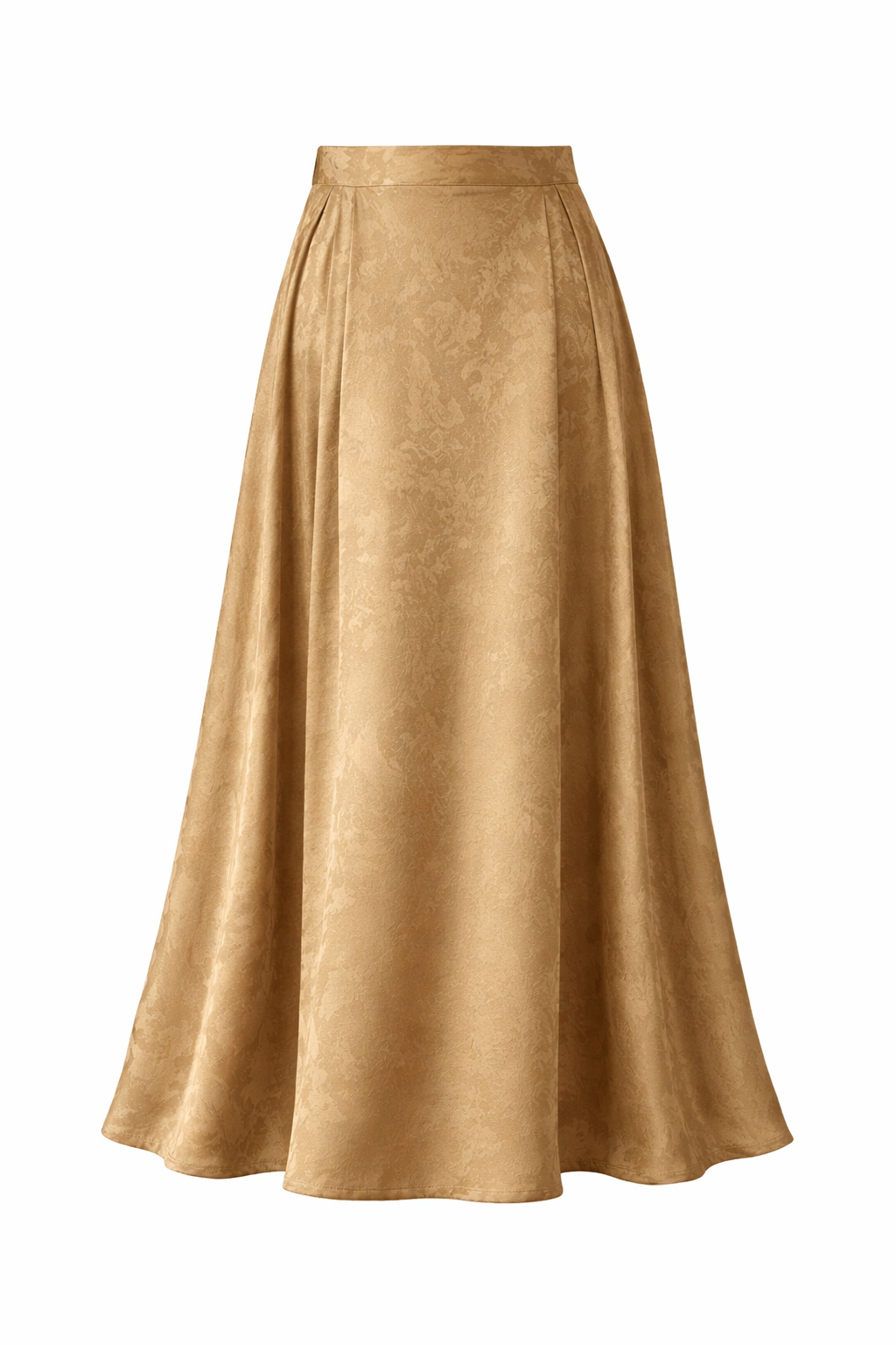 This champagne-gold maxi skirt is crafted from luminous jacquard fabric woven with subtle floral motifs. The soft sheen catches light beautifully, creating depth and quiet sophistication with every step.