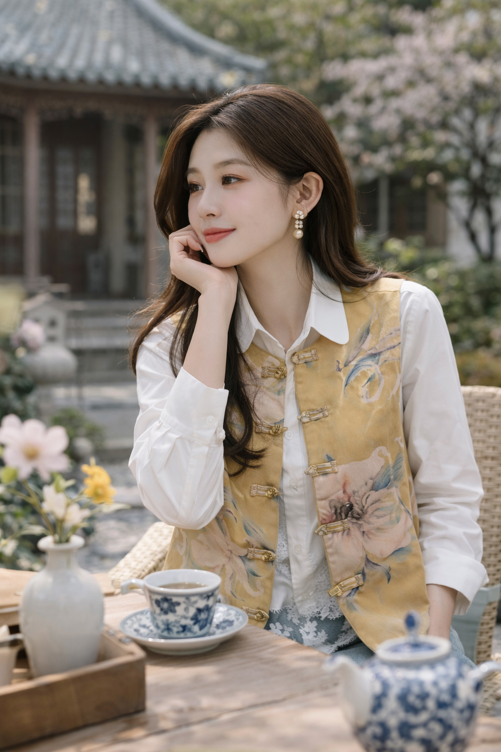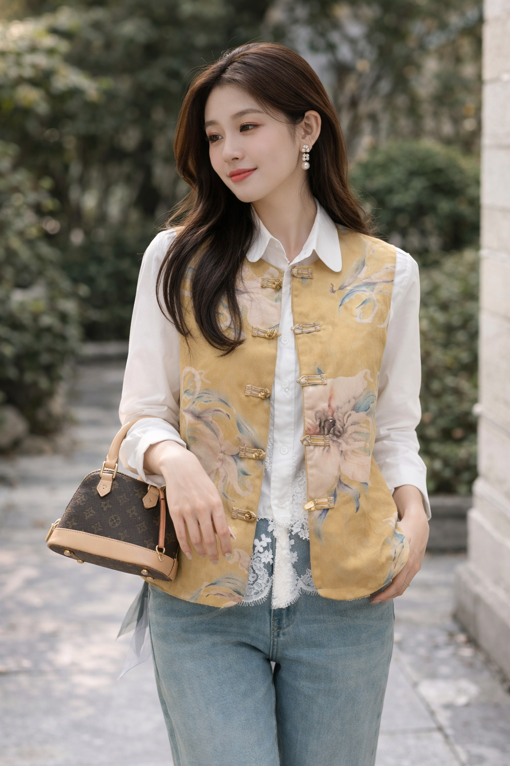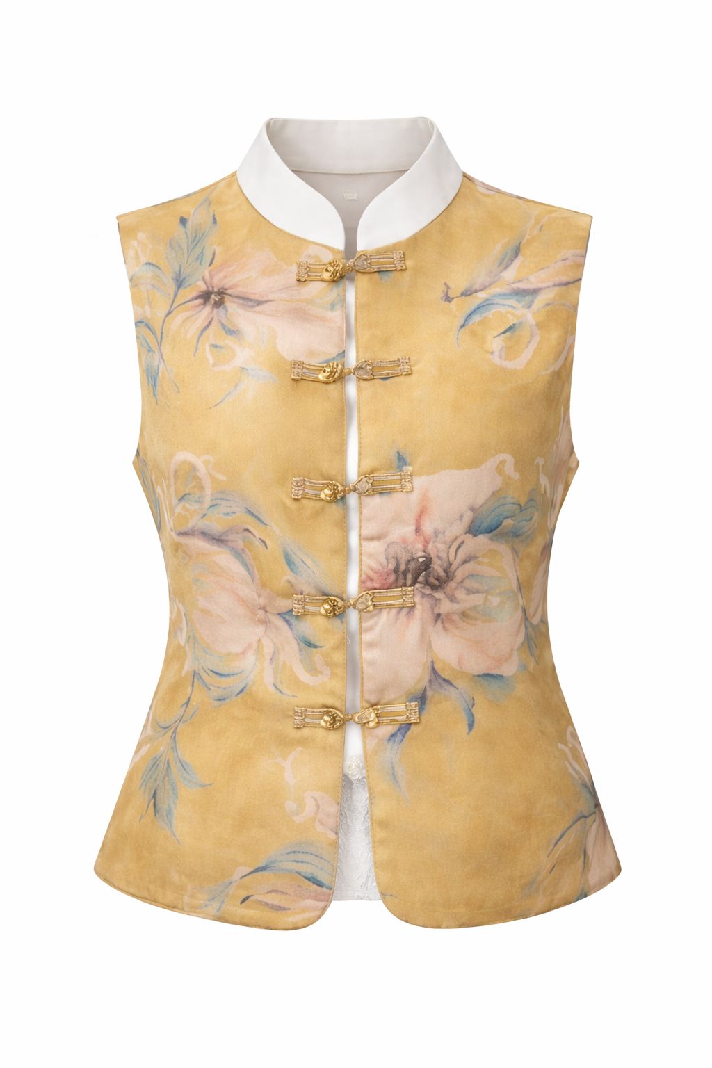 This ivory floral vest features a structured mandarin collar, delicate ink-inspired botanical print, and classic frog button closures that highlight its oriental heritage. The sleeveless silhouette makes it perfect for layering over fitted tops, dresses, or lightweight knits.