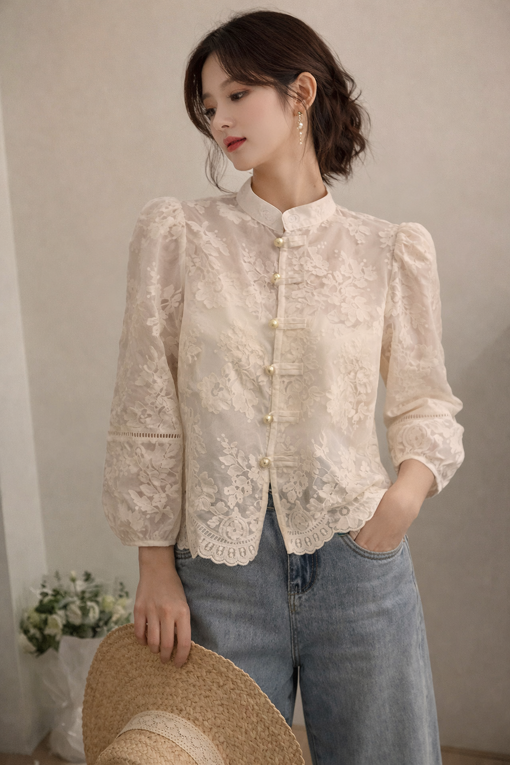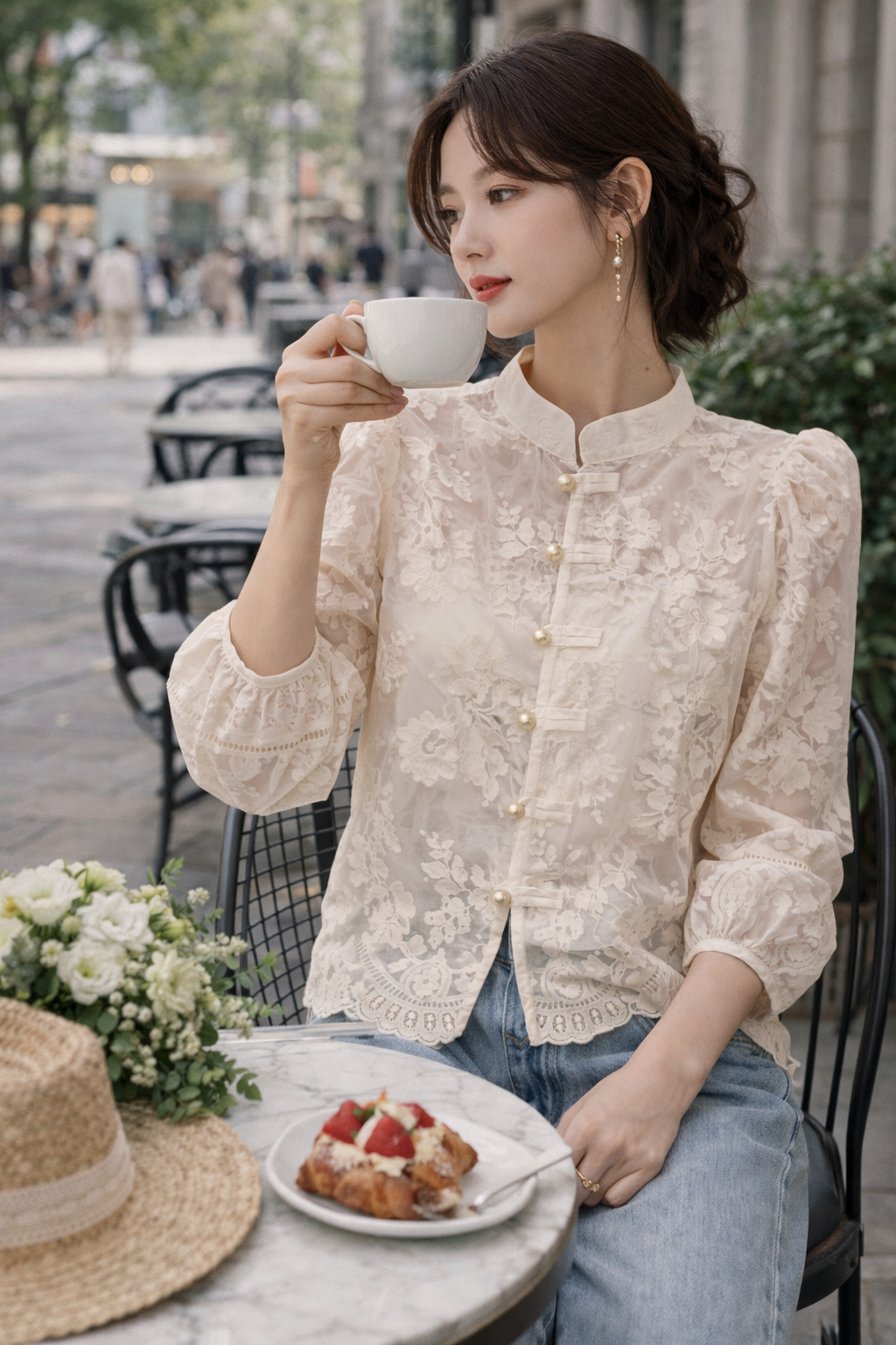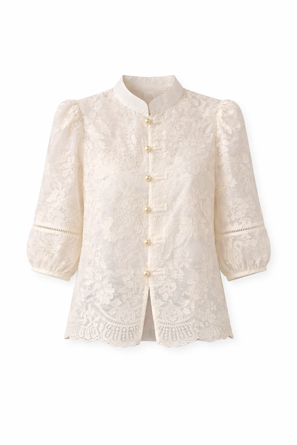 The Ivory Lace Mandarin Collar Blouse blends delicate floral lace with subtle heritage-inspired detailing. Designed with a refined mandarin collar and pearl-style button accents, this blouse captures the romance of traditional craftsmanship in a modern silhouette.