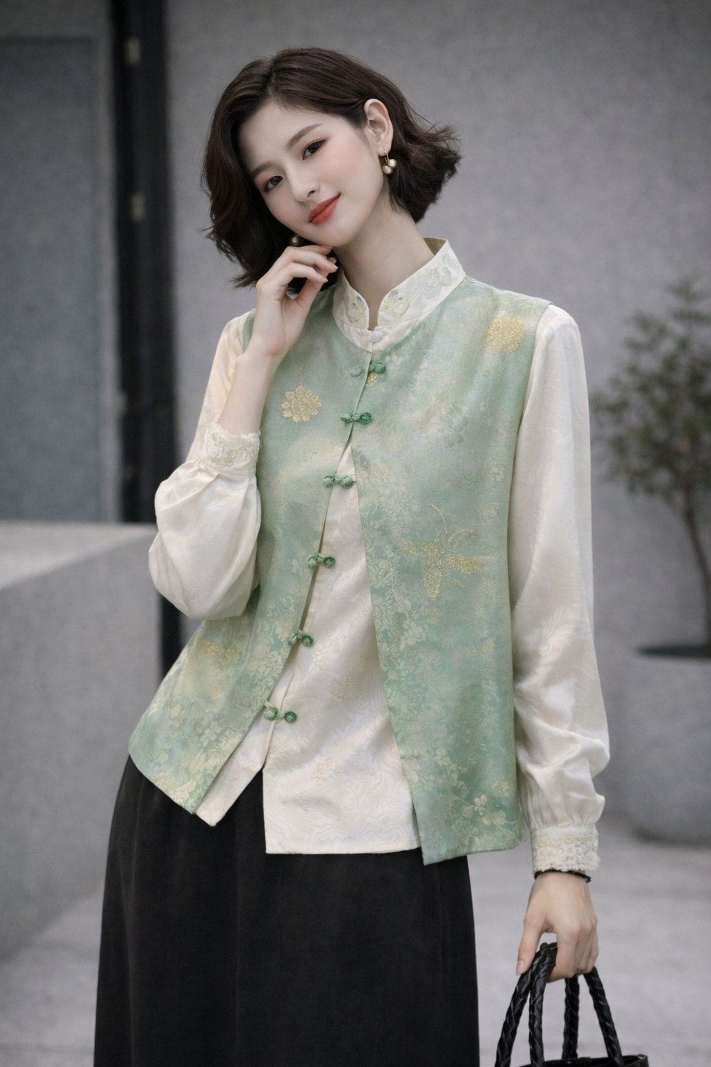 Inspired by the softness of jade and the quiet elegance of traditional Chinese tailoring, the Jade Whisper Brocade Vest blends heritage artistry with modern minimalism.