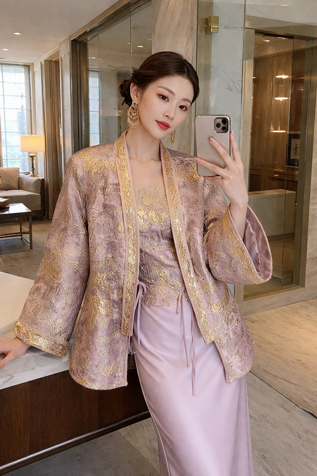 A statement of modern Eastern elegance. This three-piece ensemble blends traditional Chinese brocade artistry with contemporary couture tailoring. The outer jacket features: • Structured silhouette with relaxed draped sleeves • Lavender silk brocade woven with metallic gold florals • Delicate front ties for adjustable fit • Luxurious lining for comfort The sleeveless peplum top: • […]