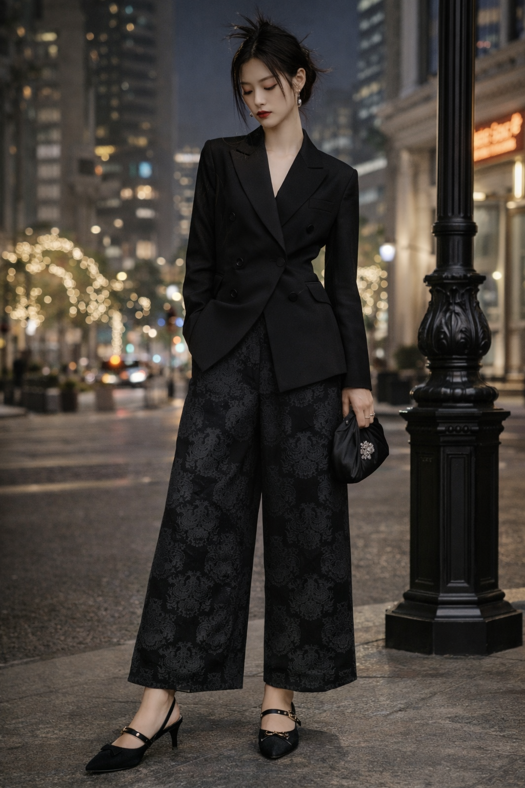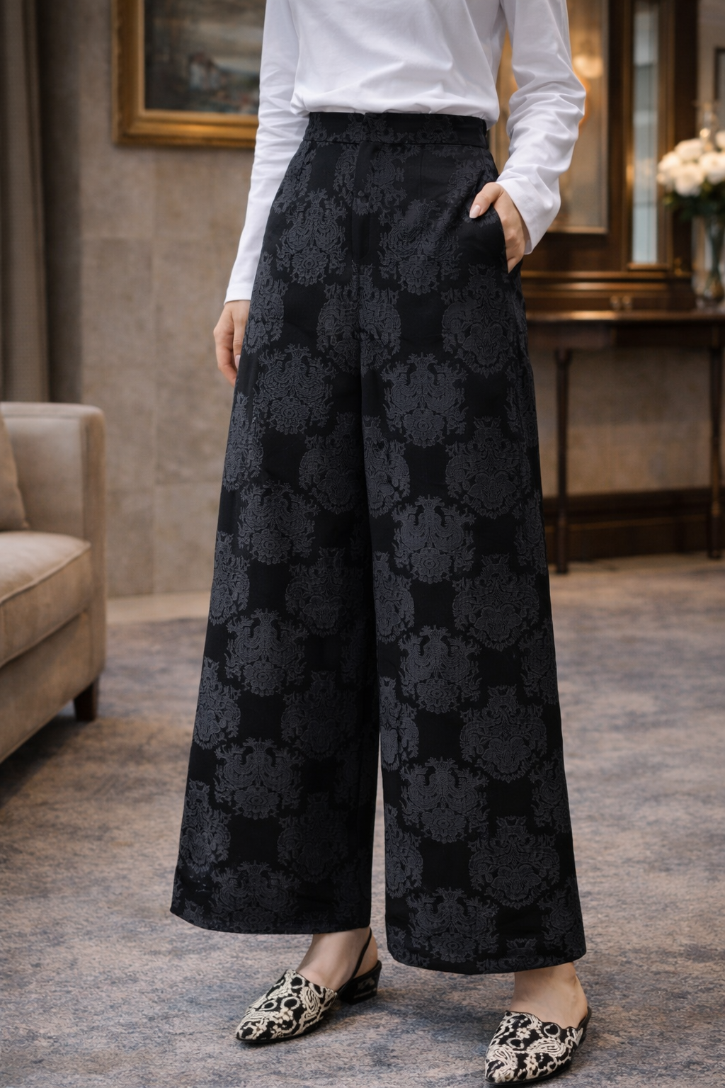 Crafted from premium black-on-black damask jacquard, these trousers reveal their intricate pattern only under light — subtle, refined, and undeniably luxurious. The high-waisted structure elongates the silhouette, while the wide-leg cut creates fluid movement with tailored precision.