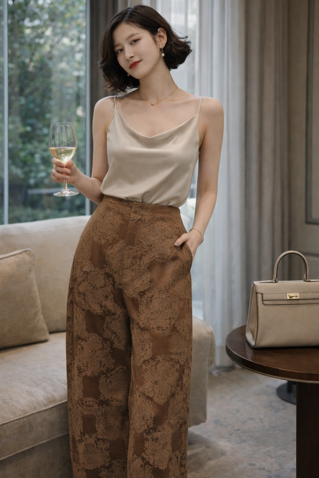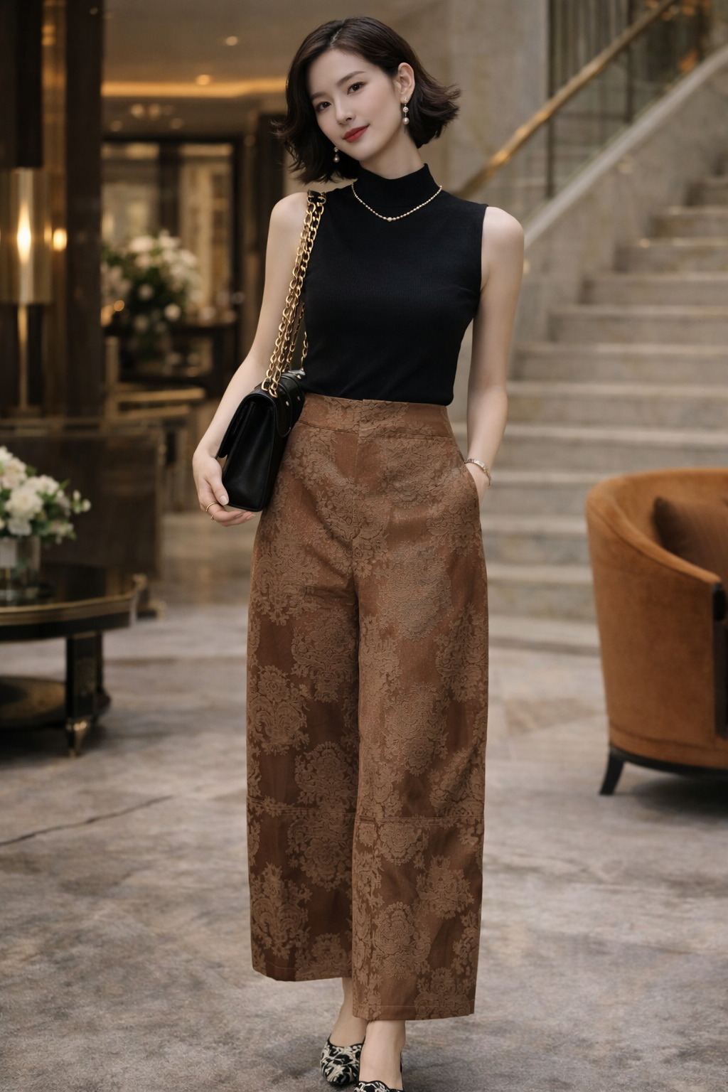 Crafted from premium floral jacquard fabric in a deep mocha tone, the intricate lace pattern adds dimension without overwhelming the silhouette. The high-waisted cut elongates the legs, while the wide-leg drape creates graceful movement with every step.