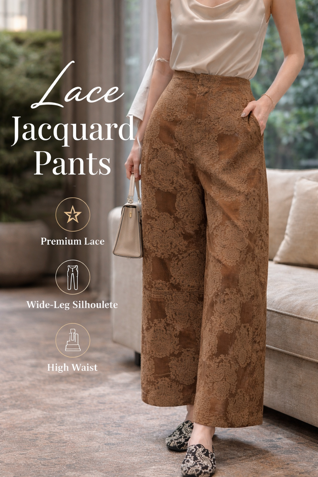 Mocha Lace Jacquard Wide-Leg Pants – High Waist Elegant Trousers