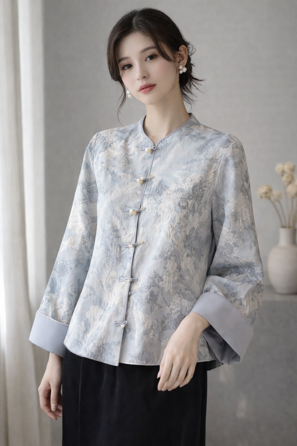 The soft floral jacquard pattern is subtly woven into the silk, creating dimension without overpowering the silhouette. Traditional frog closures and a structured stand collar honor heritage tailoring, while the relaxed wide sleeves introduce a modern architectural balance.