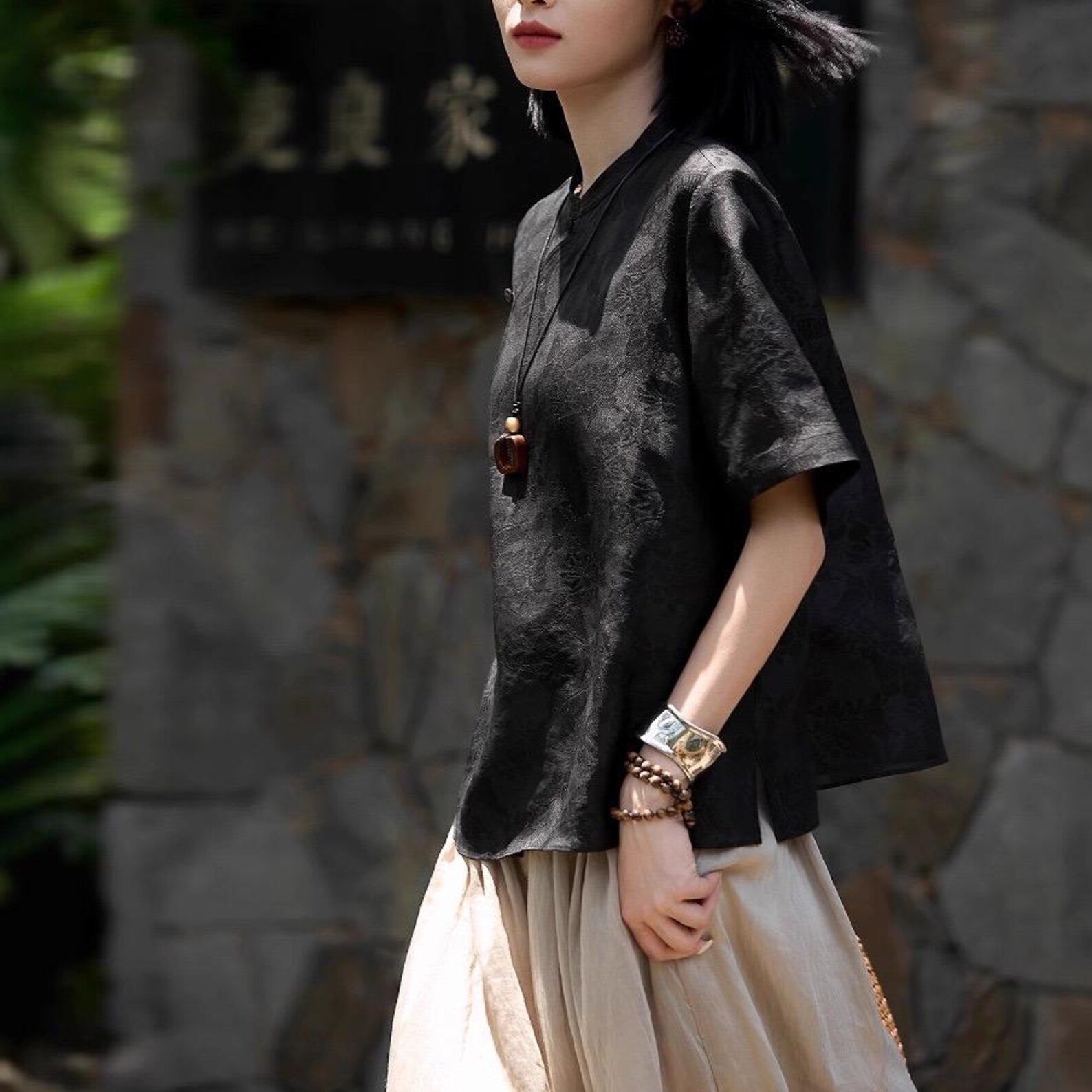 The Obsidian Jacquard Blouse is crafted from 100% Grade 6A mulberry silk, woven with a subtle tonal damask pattern that reveals itself softly under light. The charcoal-black base carries depth — not flat black, but layered texture.
