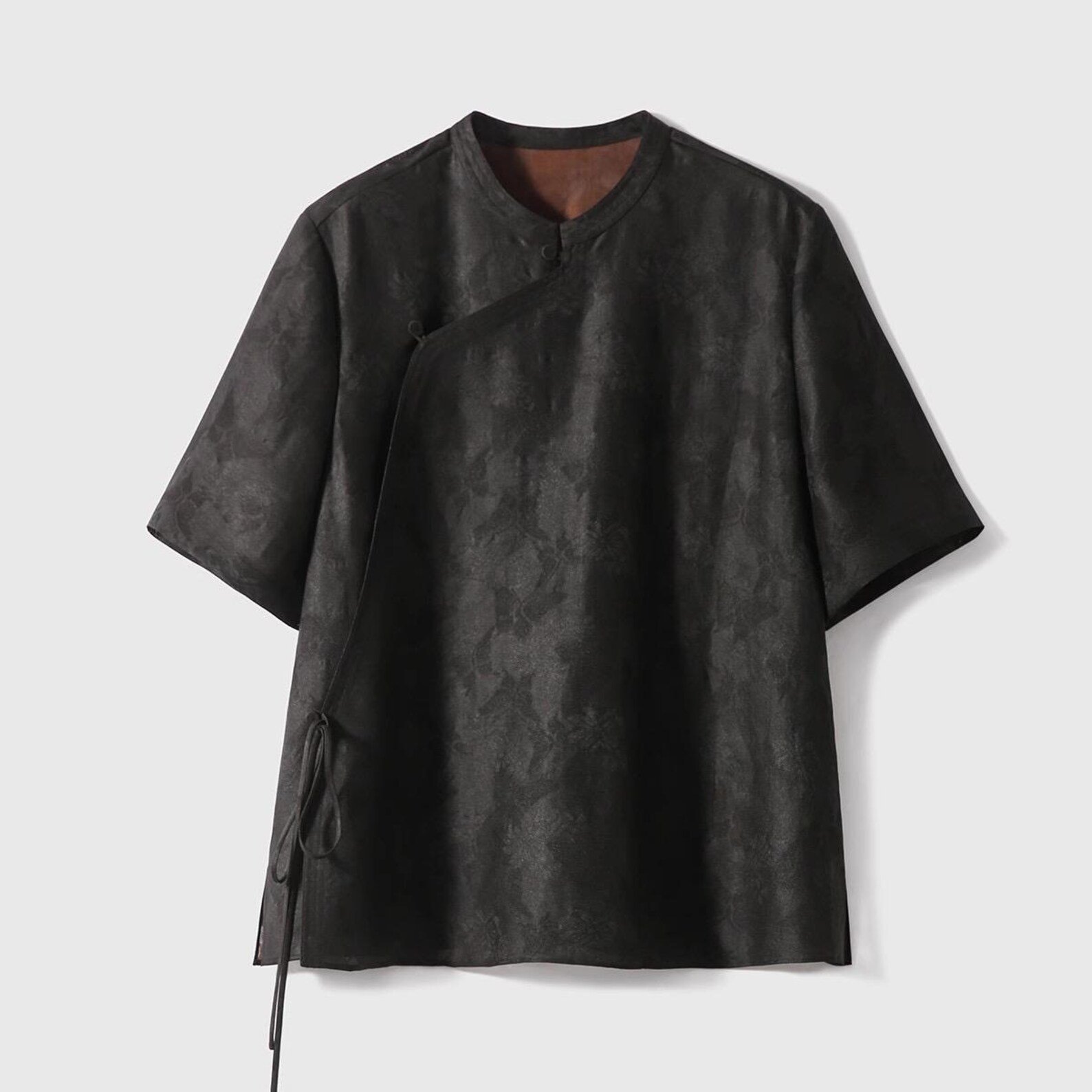 The asymmetrical wrap front and Mandarin collar bring quiet structure, while the relaxed silhouette maintains fluid movement. A delicate side tie adds a refined finishing detail without overwhelming the design.